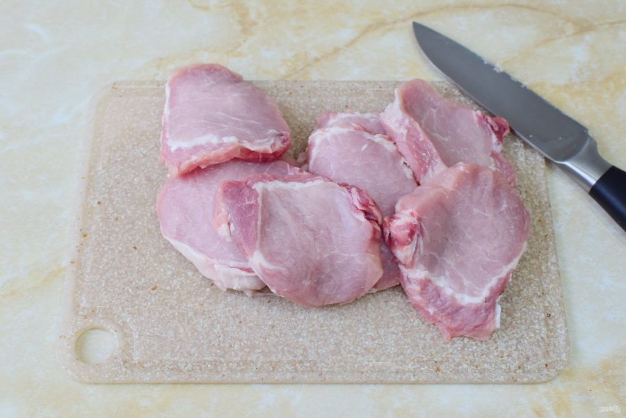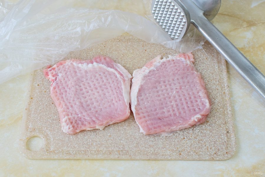 Каждый кусочек мяса накрывайте пленкой и отбивайте кухонным молоточком.