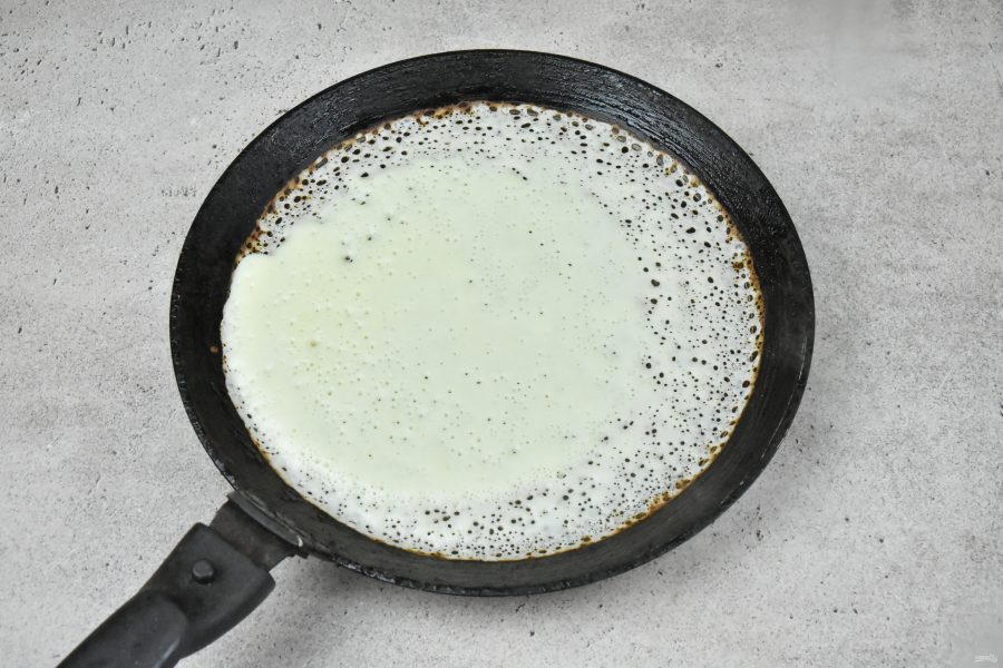 Блинную сковороду нагрейте на среднем огне, по необходимости смажьте ее маслом. Влейте порцию блинного теста и вращательными движениями руки распределите тесто по всему диаметру сковороды.