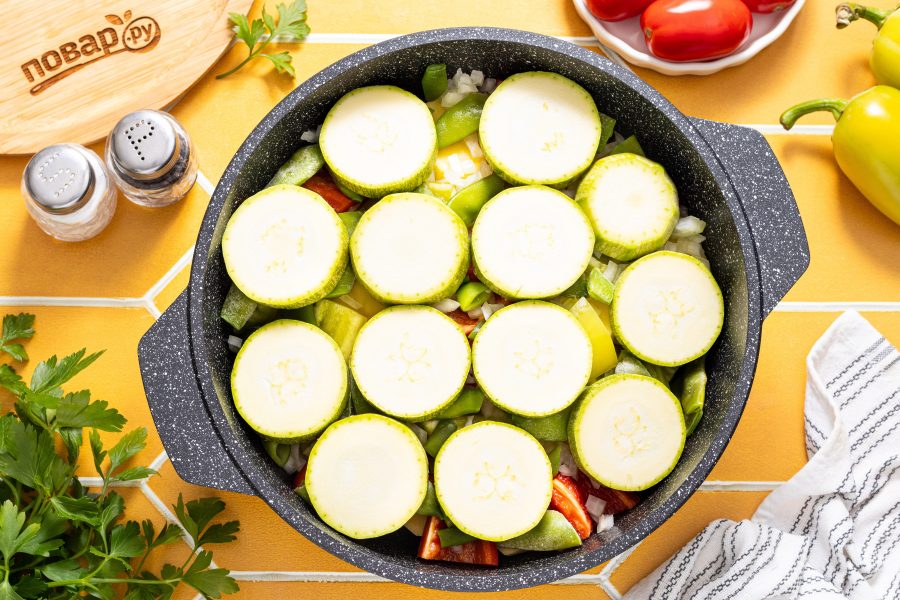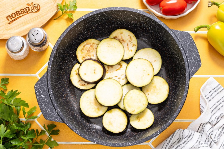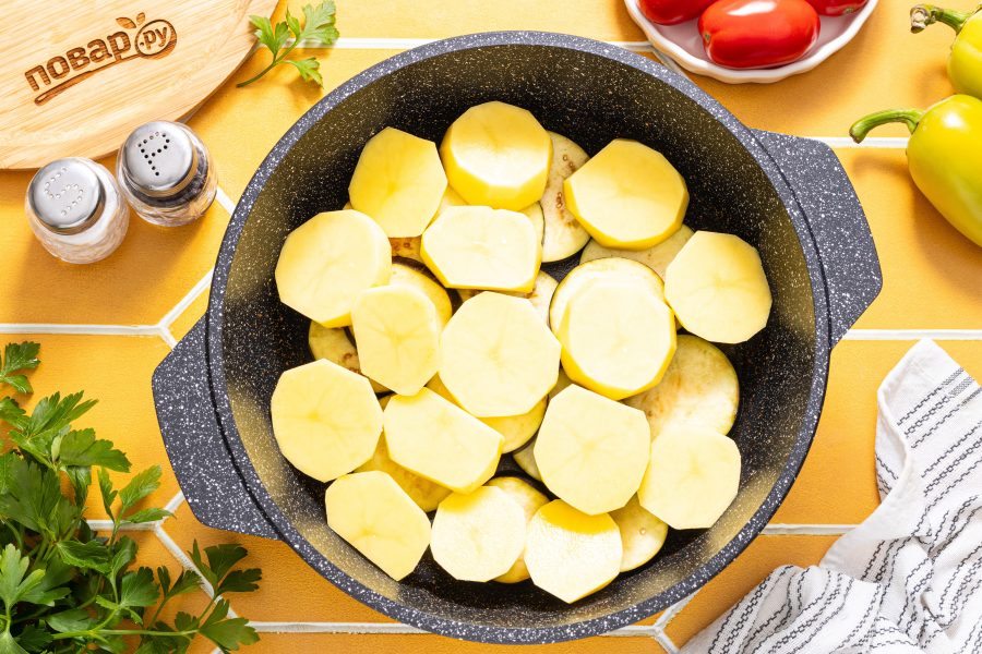 Баклажаны нарежьте толстыми кружочками. Подсолите, оставьте на 10 минут, затем сполосните и обсушите с помощью бумажных салфеток. Переложите на дно казана или кастрюлю с толстым дном.