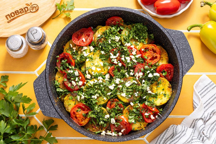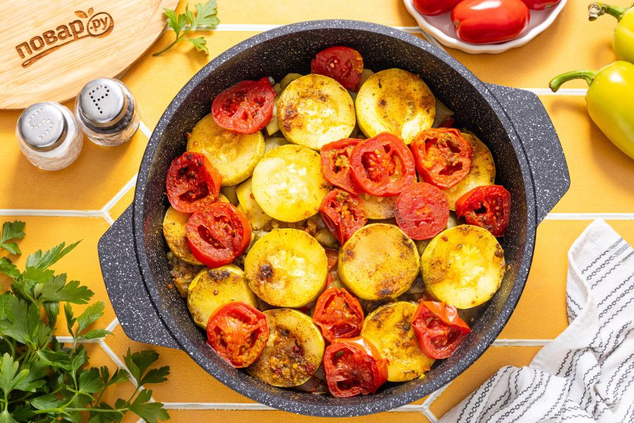 Помидоры нарежьте крупными кубиками или кружочками. Посолите, поперчите, добавьте все специи. На дно влейте немного воды (примерно 50 мл.), сверху полейте овощи растительным маслом.