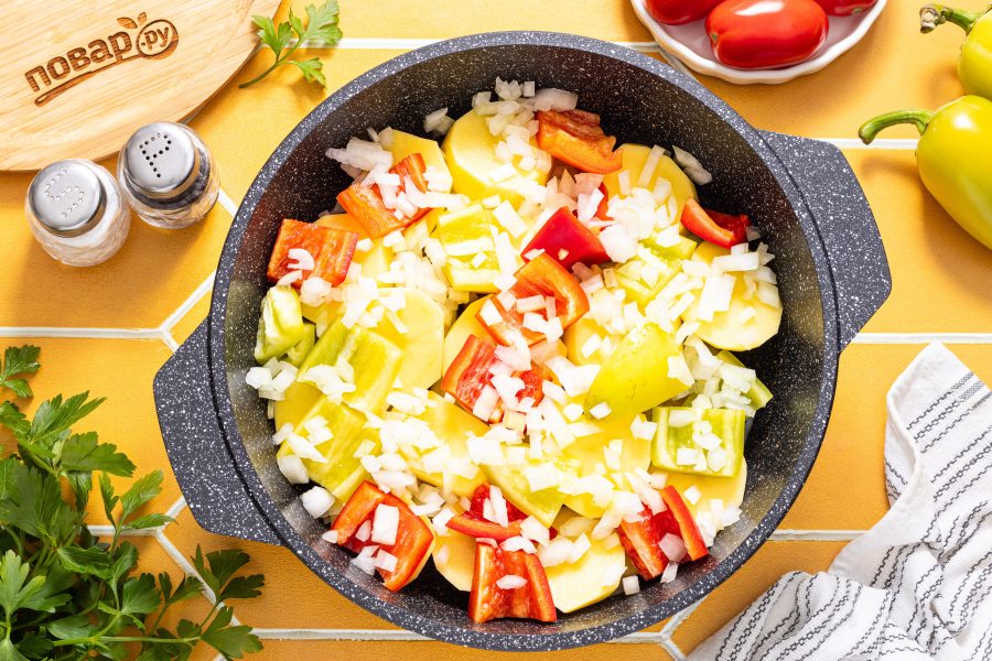Прижмите овощи тарелкой, накройте крышкой и доведите до кипения. Тушите 45-50 минут на умеренном огне. Ориентируйтесь на готовность картофеля. Овощи должны дать много сока и стать мягкими.