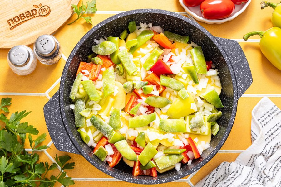 Следующим слоем выложите стручковую фасоль. У свежей фасоли отрежьте хвостики, очистите от прожилок и разрежьте на 2-3 части, а заморозку можно добавлять, как есть.