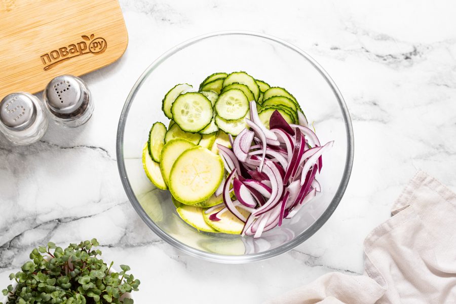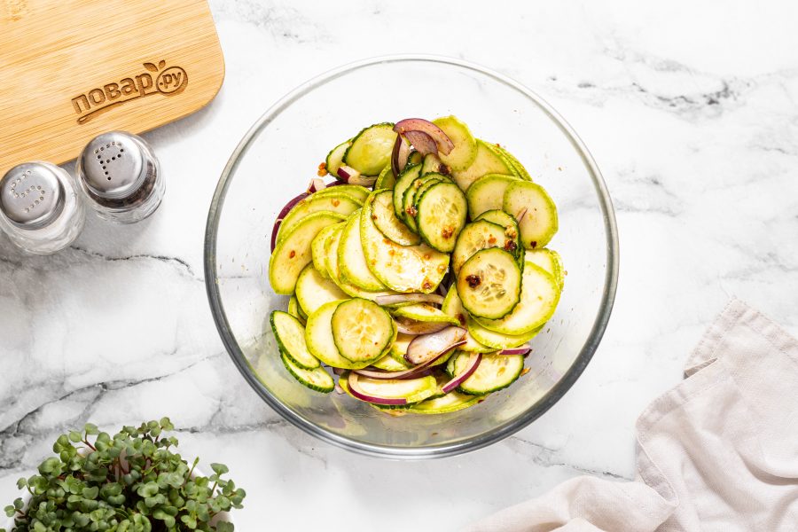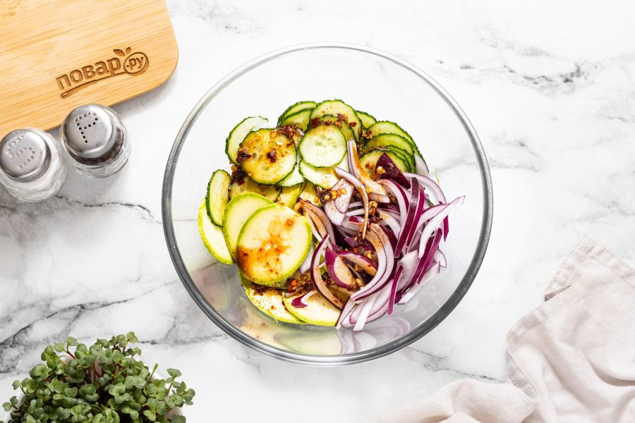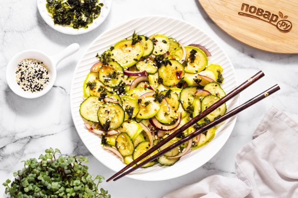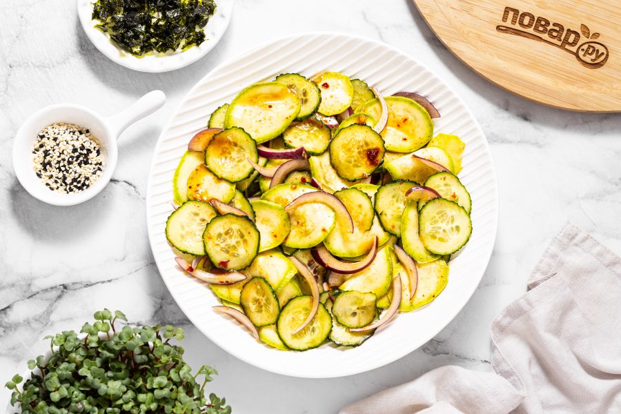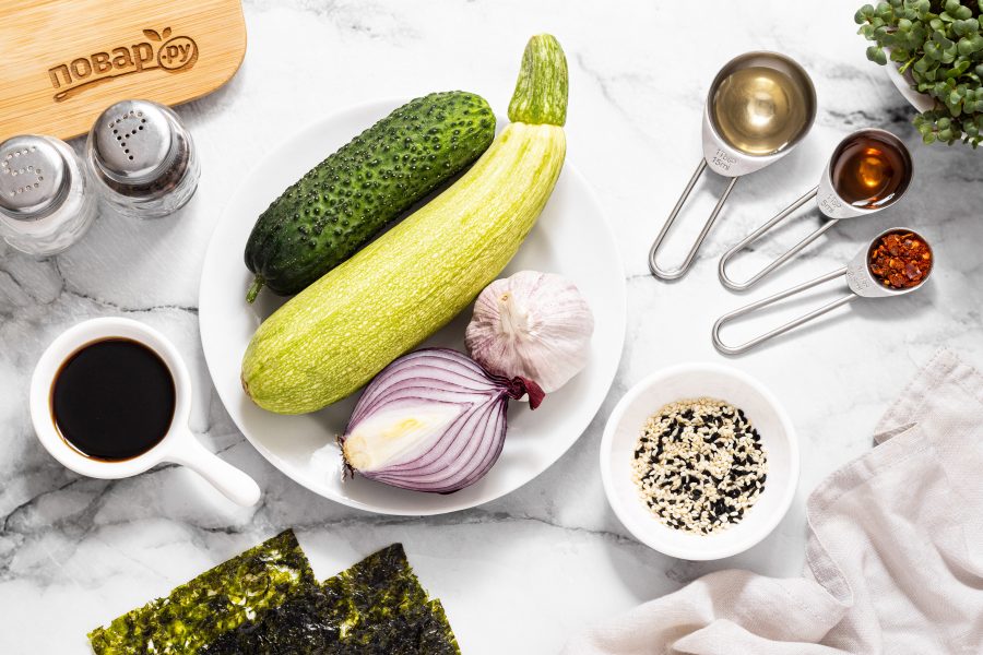 Ниже я расскажу подробнее, как приготовить азиатский салат из кабачка. Кабачки выбирайте молодые, с тонкой кожурой и нежными мелкими семенами. Можно взять цукини. Из зелени можно добавить в салат зеленый лук или кинзу, если любите. Салат получается сочным, легким и свежим. Готовится очень просто и быстро, но потребуется немного времени, чтобы салат промариновался.Состав / Ингредиенты: