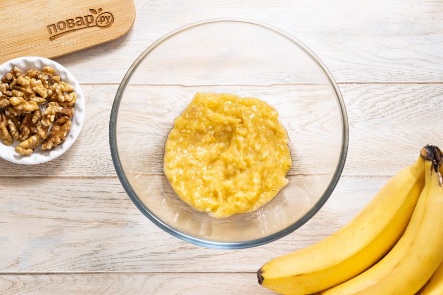 Банан очистите от кожуры, нарежьте кружочками. Вилкой или толкушкой для картофеля разомните банан до состояния пюре. Если будут оставаться какие-то комочки, ничего страшного.