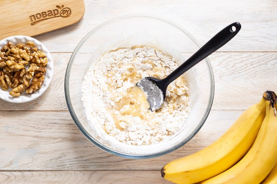 Перемешайте до однородности. Сильно вымешивать тесто не нужно, только чтобы жидкая и сухая часть объединились.