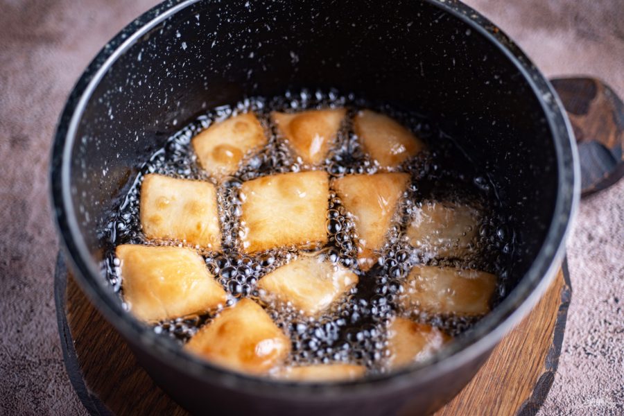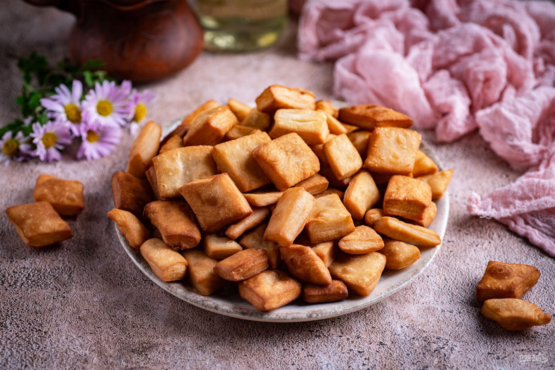 растительного масла и выкладывайте порциями кусочки нарезанного теста, обжаривайте