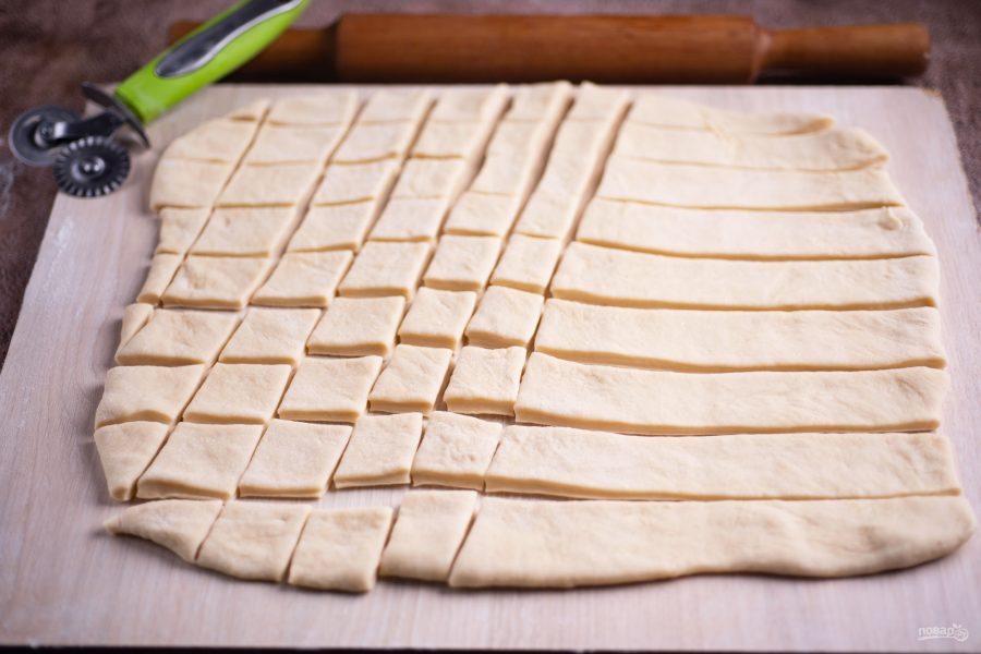 толщиной примерно в 0,7 см. и нарежьте на небольшие ромбы с помощью ножа для