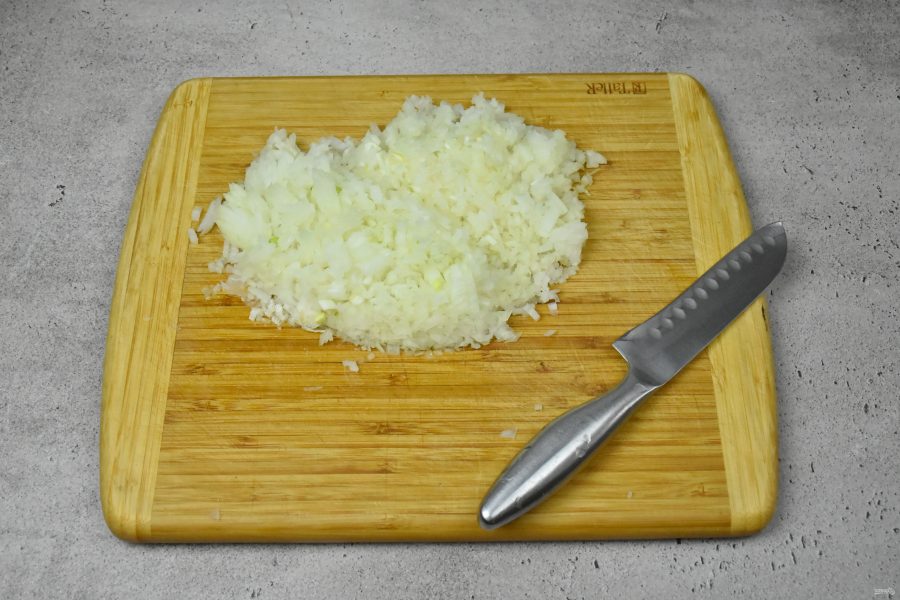 Репчатый лук нарежьте мелким кубиком. Можете воспользоваться мясорубкой или измельчить погружным блендером.
