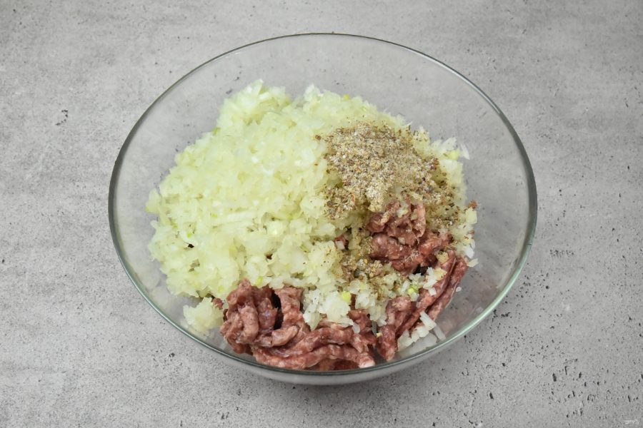 В мясной фарш добавьте подготовленный лук, соль, специи. Если фарш постный, можно добавить 1 ст.л. растительного или сливочного масла.