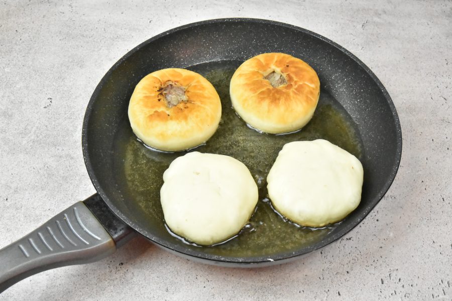 В сковороде хорошо разогрейте растительное масло. Уменьшите огнь до состояния ниже среднего. В раскаленное масло выложите заготовки полуфабрикатов дырочкой вниз. Обжаривайте беляши до подрумянивания с каждой стороны по 5-7 минут.