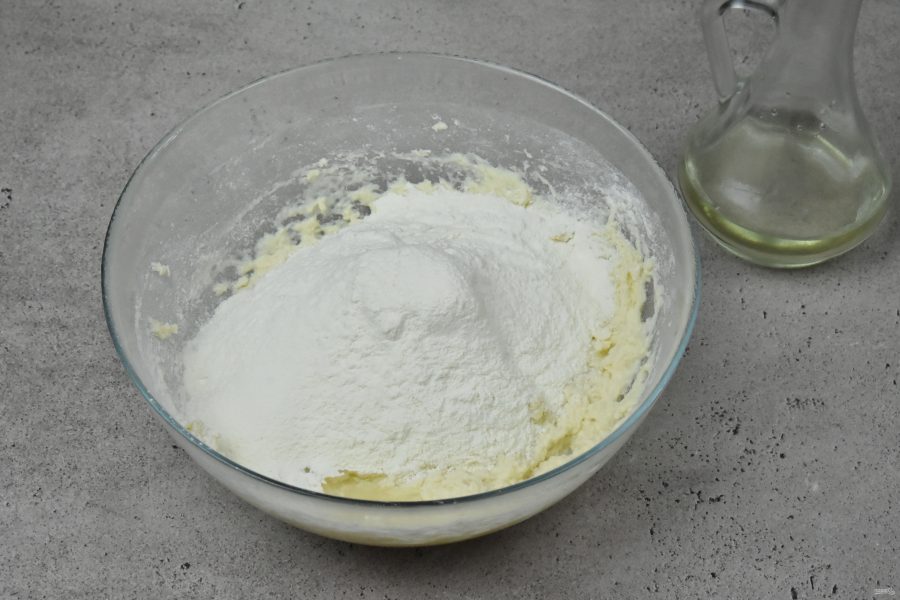 Добавьте пару столовых ложек муки из общего количества. Размешайте смесь венчиком до однородного состояния.