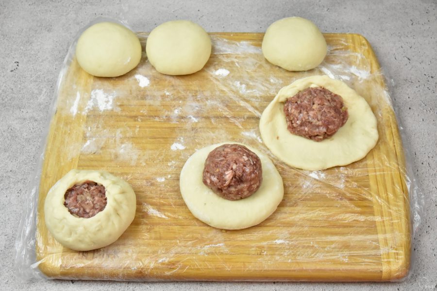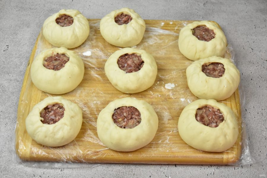 Разделите фарш на порции. Заготовку из теста слегка раскатайте в лепешку, утолщенную в центре и тоньше по краям. Выложите на лепешку начинку и подняв края теста, защипните их складочками. Оставьте в центре небольшое отверстие открытым.