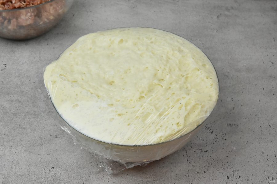 Хорошо вымесите тесто. По консистенции тесто мягкое, эластичное, не липкое. Округлите тесто в шар и переложите в емкость. Накройте посуду пищевой пленкой и оставьте в теплом месте на 1 час.