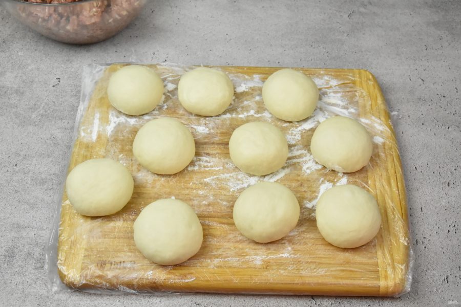 Разделите тесто на порции, весом 100-120 граммов. Каждую заготовку округлите и сложите на доску. Для предотвращения подсыхания, накройте заготовки из теста салфеткой или пленкой.