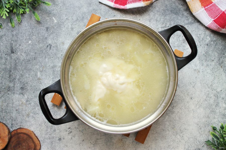 Убавьте огонь и добавьте в суп плавленый сыр. Варите на медленном огне, мешая, пока сыр полностью не растворится.