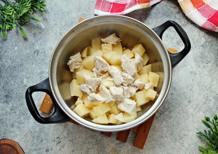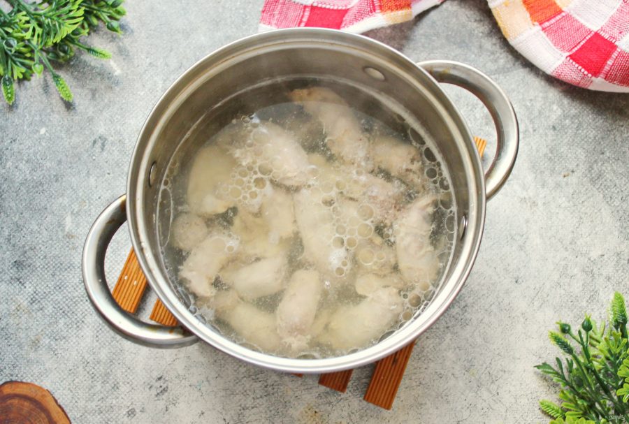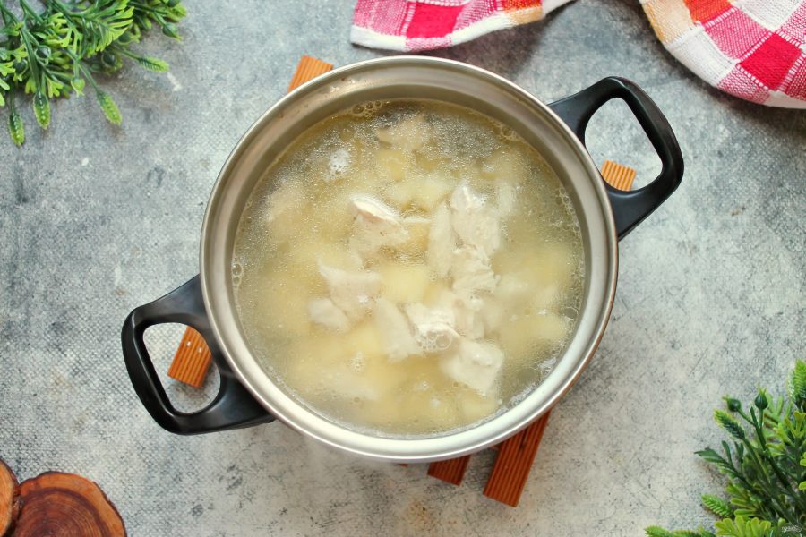 Куриное филе порежьте на кусочки, залейте холодной водой и поставьте на средний огонь. Доведите все до кипения, убавьте огонь и варите в течение 25-30 минут до готовности, снимая пену.