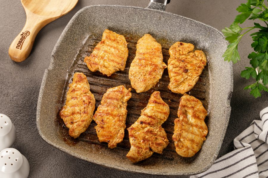 Куриное мясо предварительно маринуется, а затем запекается на раскалённой сковороде. Желательно использовать сковороду гриль или с хорошим антипригарным покрытием, чтобы минимализировать расход растительного масла. Рецепт можно смело причислить к диетическому меню, но при этом получается бесподобно вкусно! Грудка остаётся сочная и невероятно мягкая — можно подать на обед в горячем виде или использовать в холодном для приготовления различных салатов или бутербродов. Непременно рекомендую попробовать!Состав / Ингредиенты: