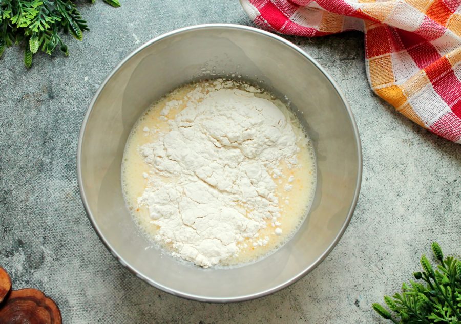 Пшеничную муку соедините с разрыхлителем и перемешайте венчиком. Просейте муку в молочную массу порциями, каждый раз, хорошо перемешивая до однородности. Дайте постоять тесту 10-15 минут.