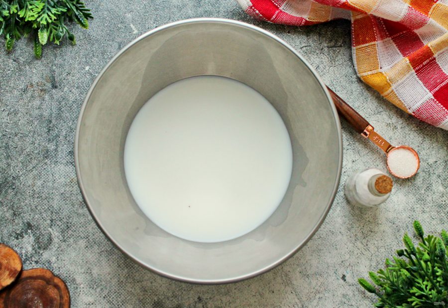 В миску налейте теплое молоко, добавьте соль, сахар и перемешайте до растворения кристаллов.