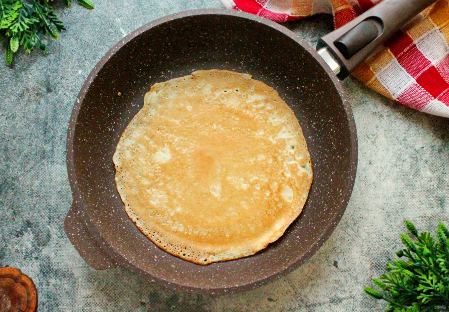 Смажьте сковороду растительным маслом и разогрейте на среднем огне. Налейте часть теста, распределите по дну и обжарьте до полного схватывания теста и румяного низа. Переверните блин и обжарьте вторую сторону до румянца. Переложите блин на тарелку и жарьте блины, пока тесто не закончится.