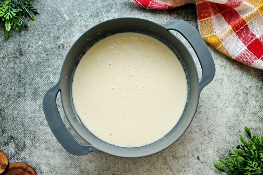 Вбейте в молоко яйца и перемешайте венчиком до однородности.