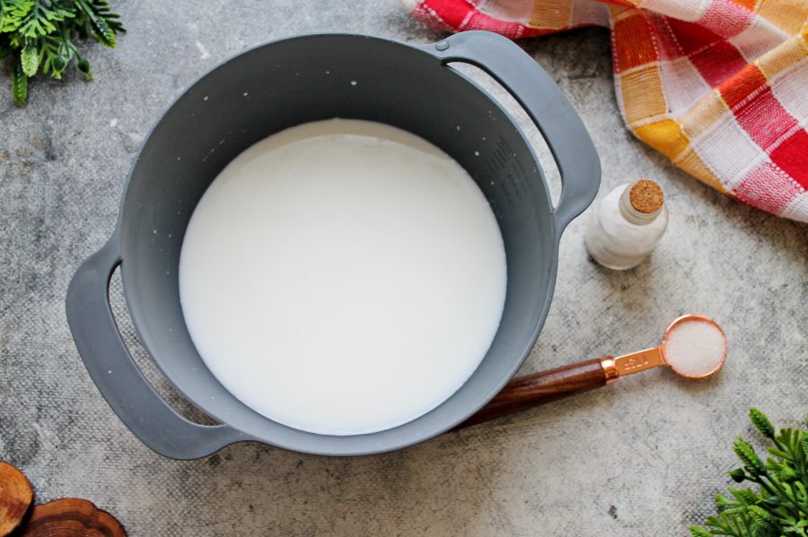 Для приготовления блинчиков подготовьте тесто. Для этого в миску налейте теплое молоко и добавьте соль, сахар, перемешайте до растворения кристаллов.