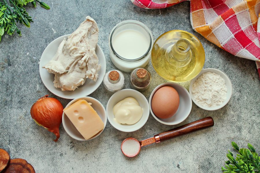 Подготовьте все необходимые ингредиенты для приготовления блинчиков с куриной грудкой. Яйца и молоко достаньте заранее, чтобы стали теплыми. Репчатый лук почистите и сполосните.