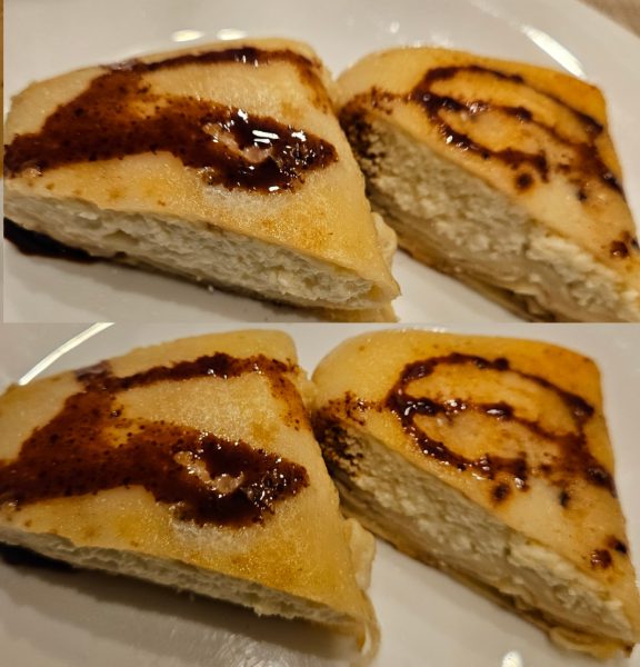 Вот блинчики и готовы, внутри творог-а сгущенкой полил сверху. Понравились-вкусные.