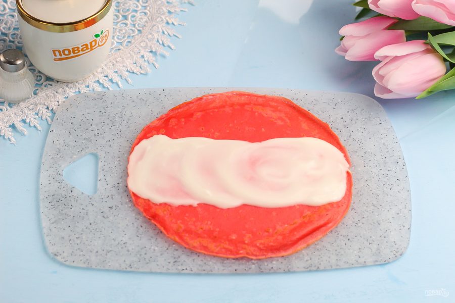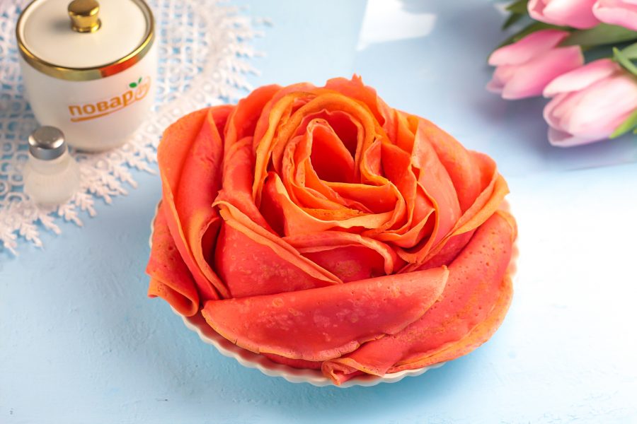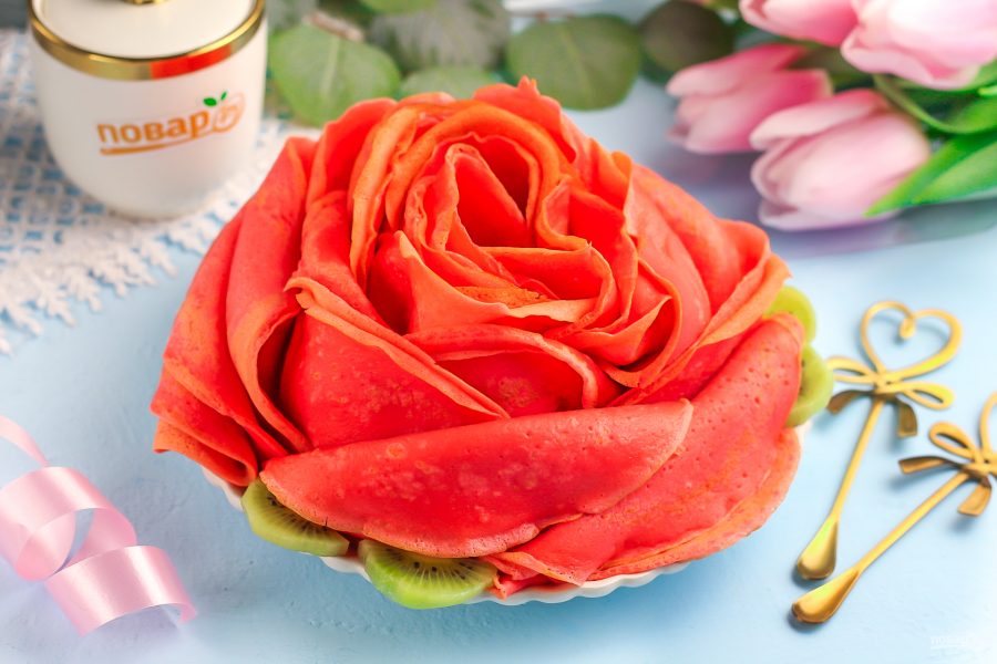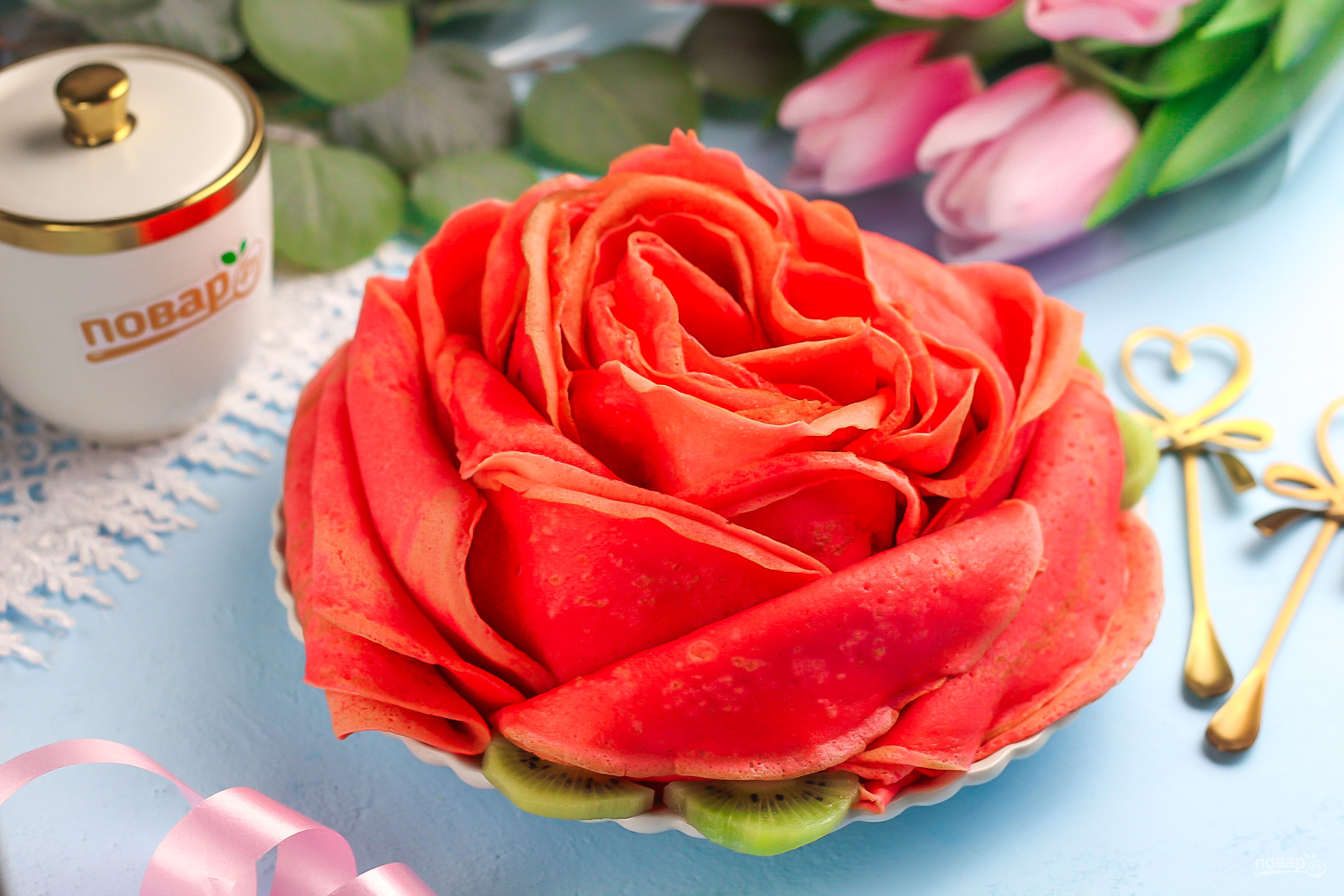 Побалуйте своих любимых людей красочным блинным тортом в виде розы. Цвет блинам придает краситель, но можно использовать свекольный сок. Крем приготовьте из сметаны или взбитых сливок. Пробуйте!