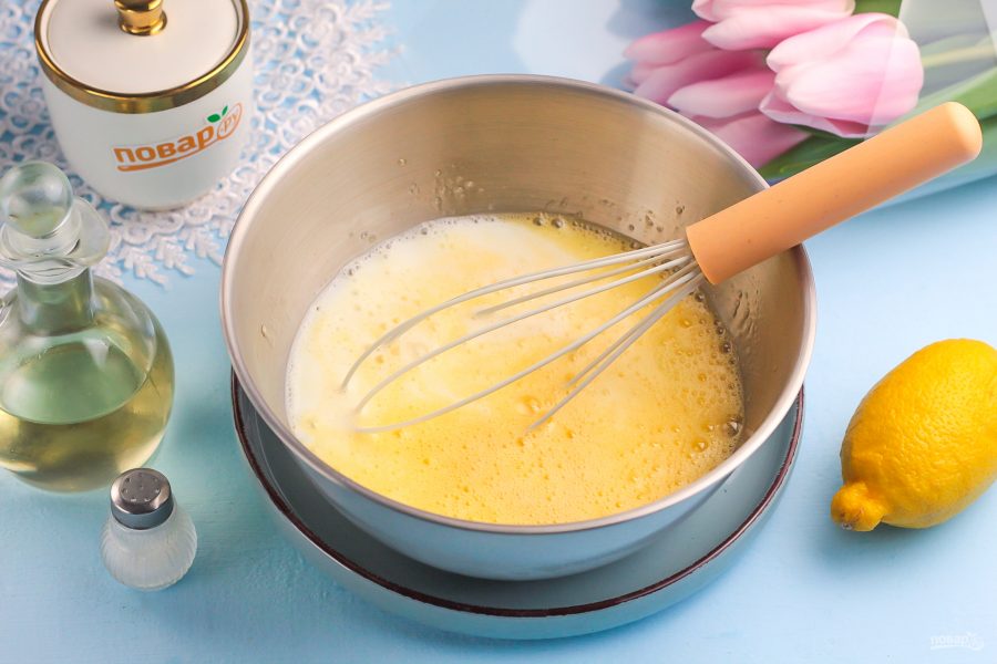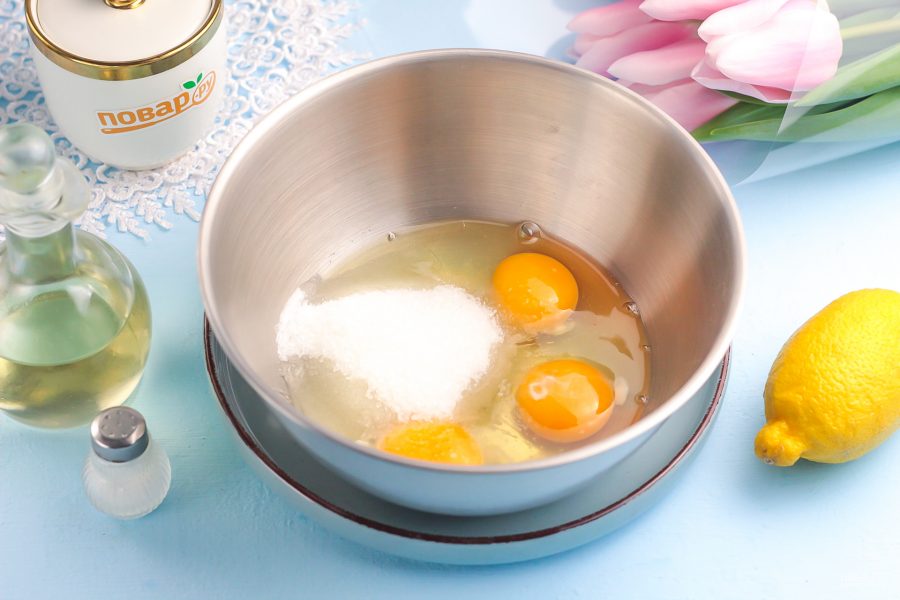 Вбейте куриные яйца в глубокую емкость: миску или салатник. Всыпьте туда же сахар и соль. По желанию — ванильный сахар. Тщательно все взбейте.