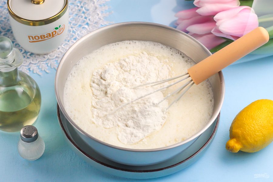 Влейте кипяток и быстро взбейте. Всыпьте пшеничную муку по частям и вмешивайте ее в жидкую основу, но не взбивайте.
