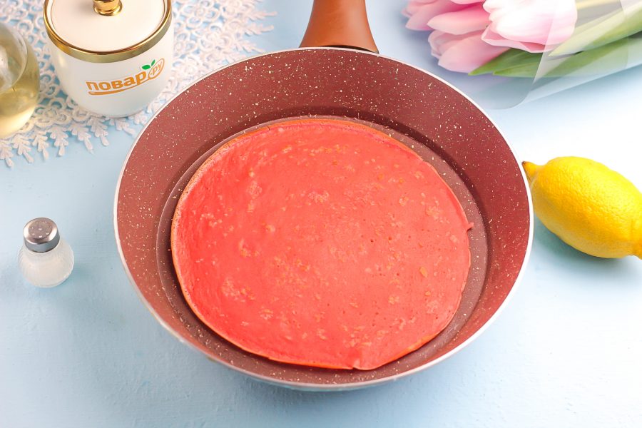 Прогрейте сковороду на плите, смажьте ее дно в первый раз растительным маслом и влейте немного теста на середину. Обжарьте 1 минуту и переверните на другую сторону не зажаривая! Если зажарите, то блины станут коричневатыми, а важно оставить их розовыми! Прожарьте 10-20 секунд и выложите на доску, тарелку.