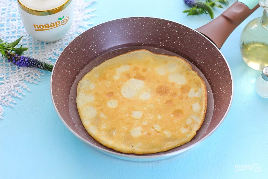 Прогрейте сковороду на плите, смажьте ее дно в первый раз растительным маслом и влейте половину половника теста, округлите его. Испеките блин с каждой стороны по 1-2 минуты. Если он начнет пригорать, уменьшите нагрев.