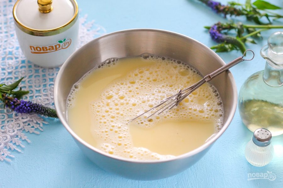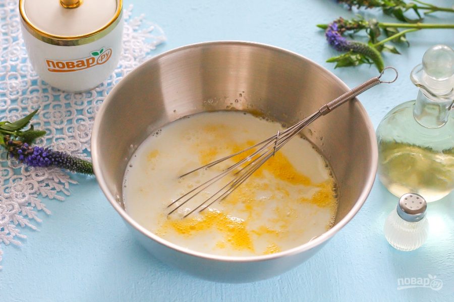 Влейте молоко и еще раз перемешайте, поднимая яичную массу со дна венчиком.