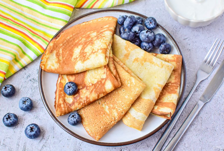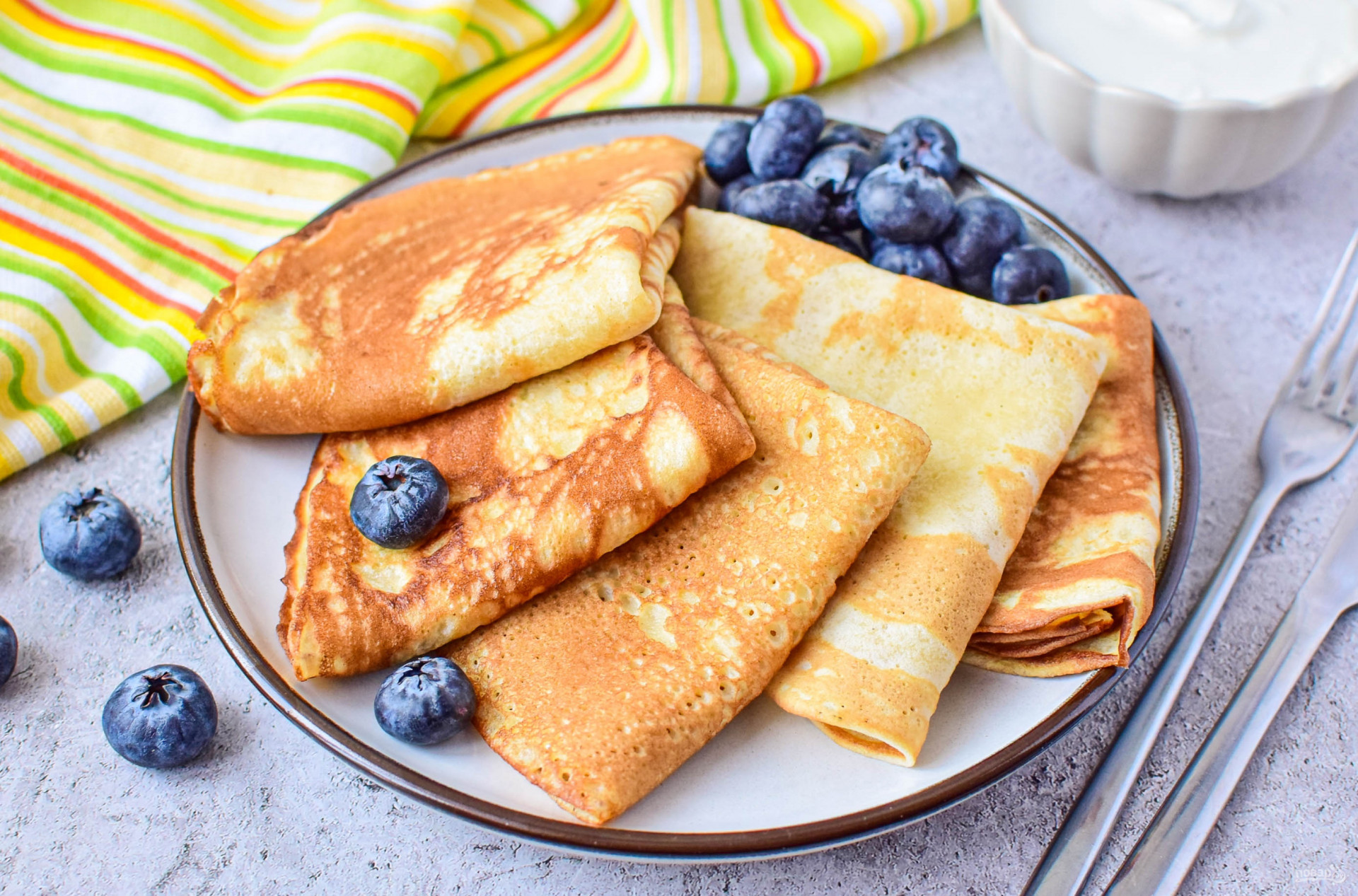 Дополните блинчики сметаной и ягодами и подавайте к столу.