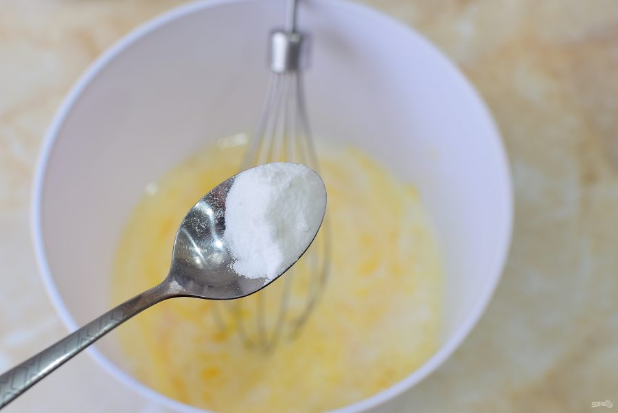 Добавьте щепотку соли и ванилина. Всыпьте соду.