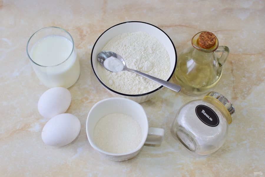Для приготовления блинчиков подготовьте необходимые ингредиенты. Кефир можно взять любой жирности. Муку заранее просейте через сито, чтобы насытить её кислородом.