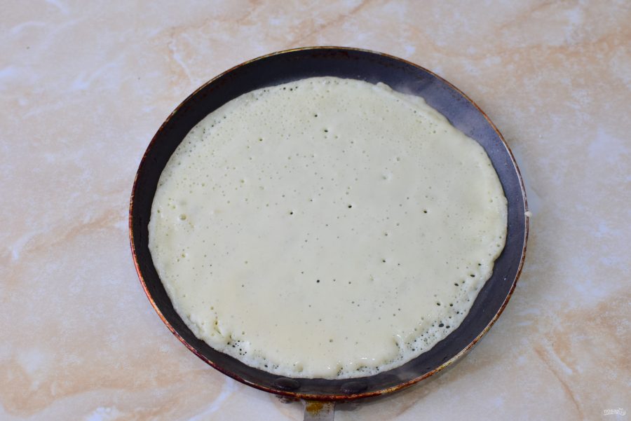 Горячую блинную сковороду смажьте растительным маслом и налейте тесто. Распределите его тонким слоем по всей поверхности сковороды.