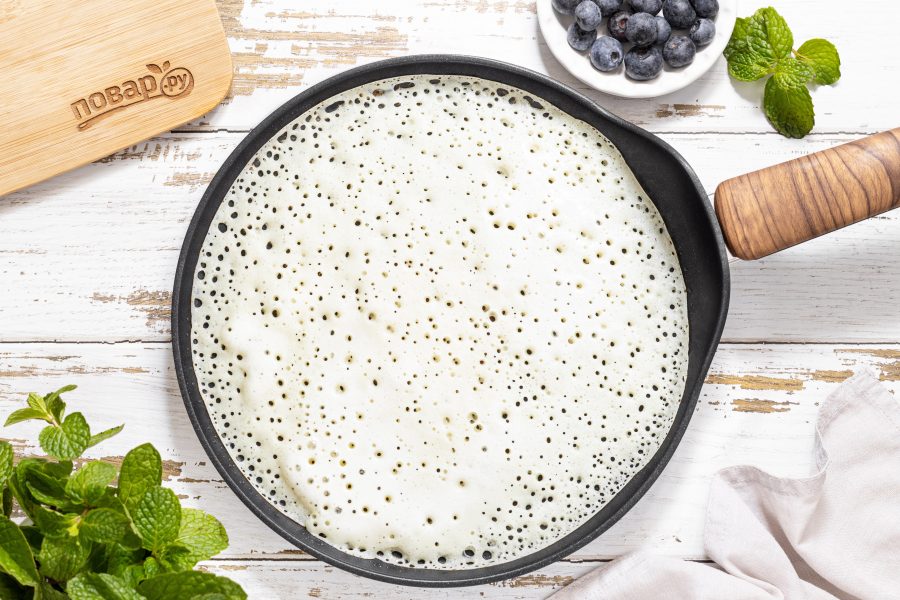 Хорошо разогрейте сковороду на среднем огне. Первый раз немного смажьте растительным маслом, после можно готовить без масла, если сковорода антипригарная. Влейте столько теста, чтобы оно равномерно распределилось тонким слоем по диаметру сковороду. Выпекайте до золотистого цвета.