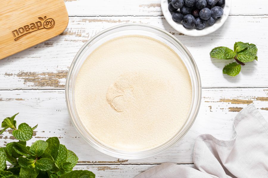 Влейте в миску теплую воду. Добавьте сухие дрожжи, хорошо размешайте, чтобы они полностью растворились.