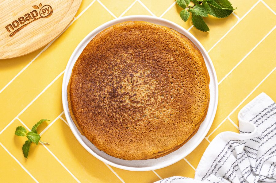 Хорошо разогрейте сковороду, слегка смажьте растительным маслом в первый раз, а затем выпекайте на сухой сковороде. Влейте столько теста, чтобы оно равномерно распределилось тонким слоем по диаметру сковороды. Выпекайте до золотистого цвета.