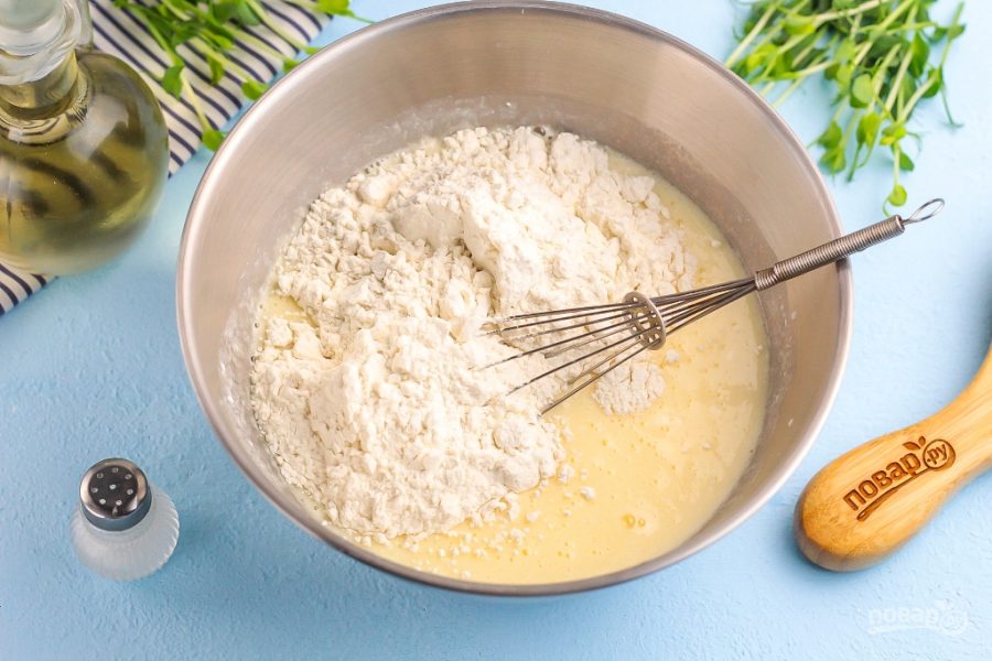 Всыпьте сахар и соль, тщательно перемешайте, чтобы они растворились. Вбейте куриные яйца, влейте воду и взбейте все венчиком сразу же, пока яйца не свернулись.
