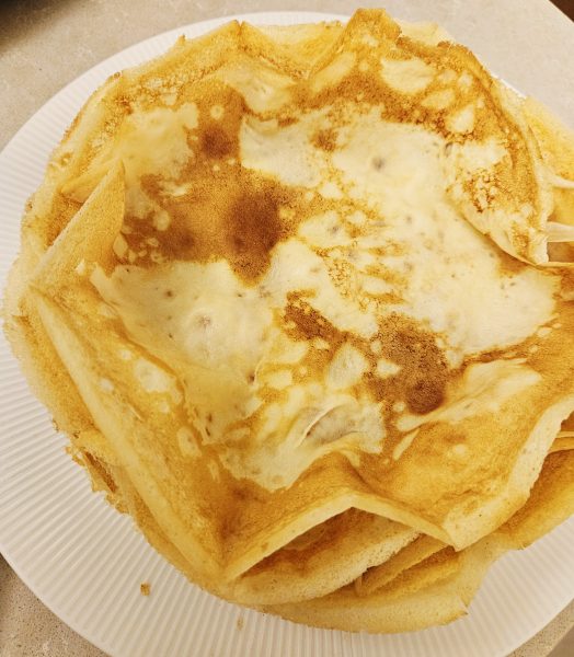 Выпекайте блинчики один за другим с обеих сторон (примерно секунд 50 с одной стороны). По мере необходимости смазывайте сковороду маслом.