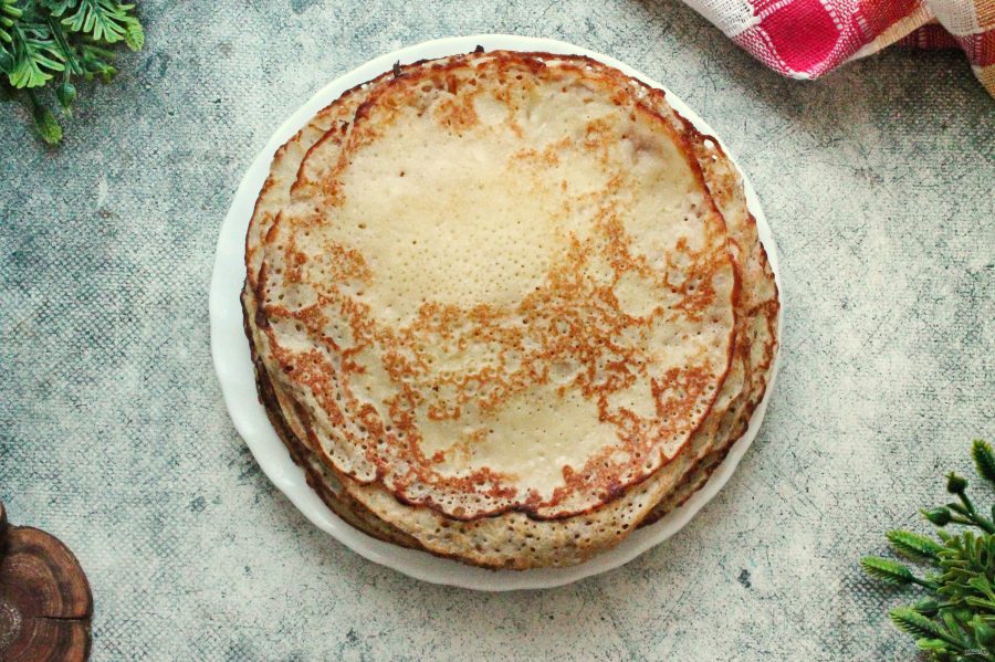 Сковороду для блинов смажьте растительным маслом и разогрейте на среднем огне. Влейте часть теста и распределите по дну сковороды. Обжарьте блин до румяной корочки сначала с одной стороны, переверните и поджарьте вторую сторону. Готовый блин снимите с огня и испеките блины, пока не закончится тесто.