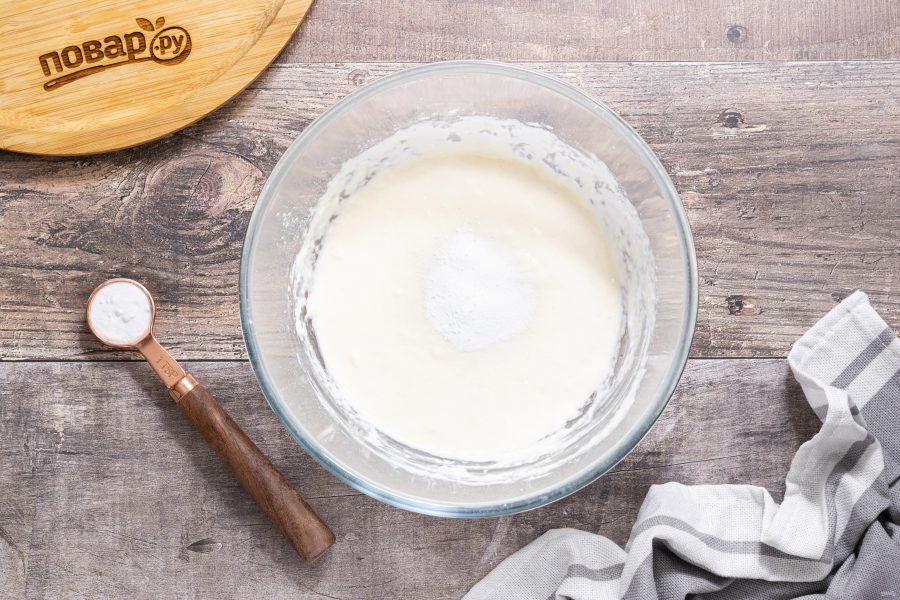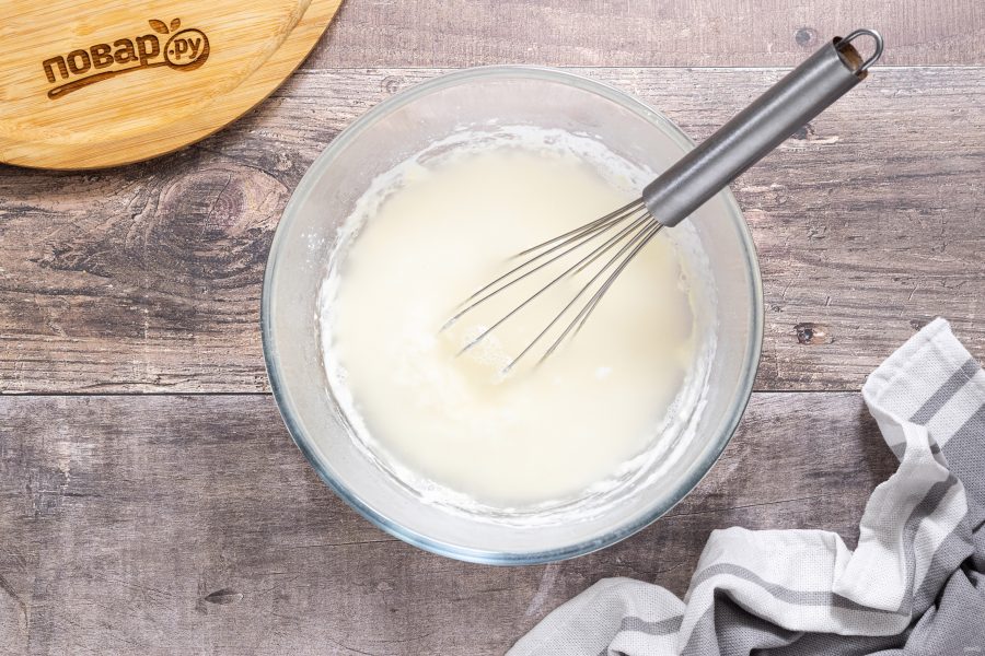Венчиком сразу перемешивайте, чтобы не оставалось комочков. На этом этапе по консистенции тесто должно получиться, как на оладьи.