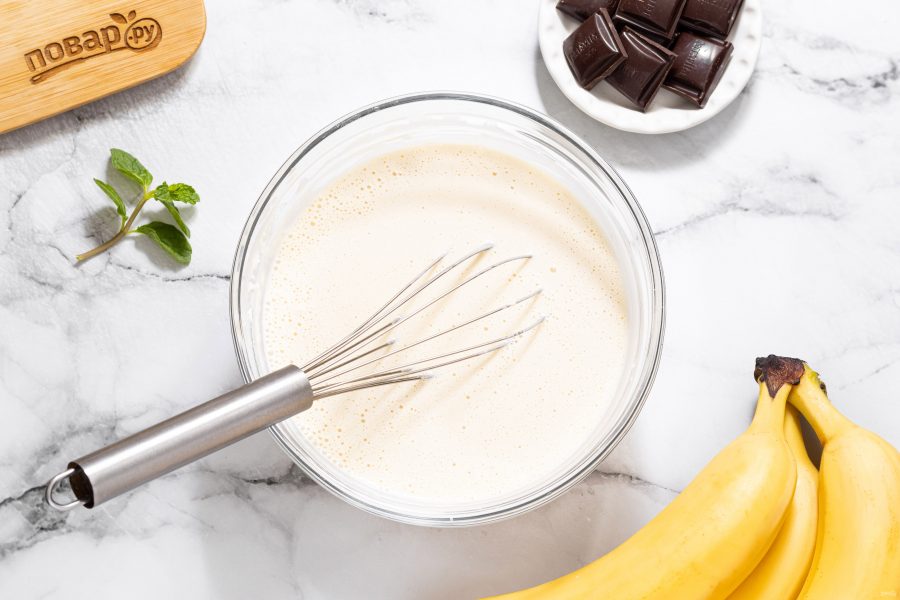Влейте молоко. Размешайте до однородности, чтобы не оставалось комочков. Накройте пленкой миску и оставьте тесто постоять на 25 минут.