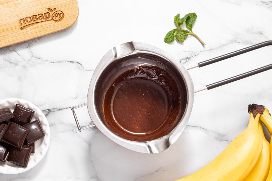 Для шоколадного соуса крупно порубите шоколад. Растопите его в ковшике влейте молоко и перемешайте до однородности.