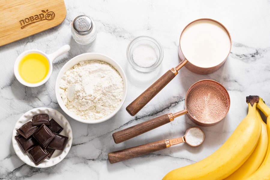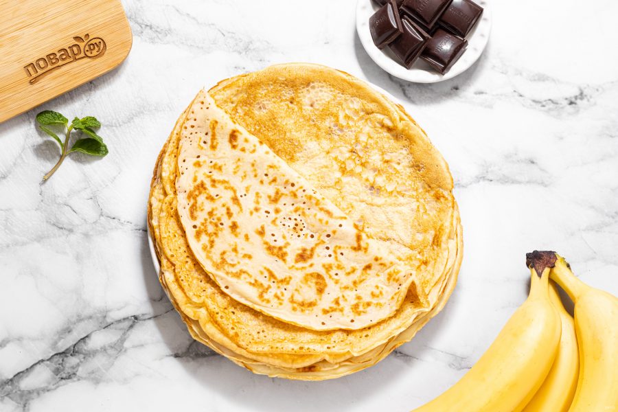 Выложите начинку из бананов в центр блина. Сверните его конвертиком. Повторите, пока не закончится блины и начинка из бананов.