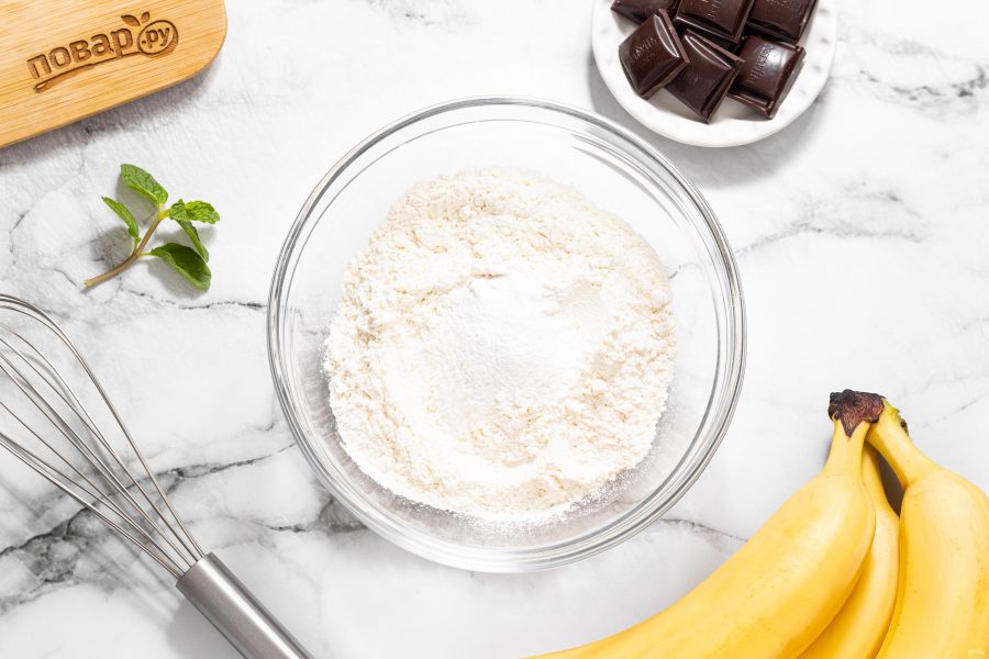 Для начала приготовьте блины. Для этого просейте в глубокую миску пшеничную муку. Добавьте сахар, соль и разрыхлитель.