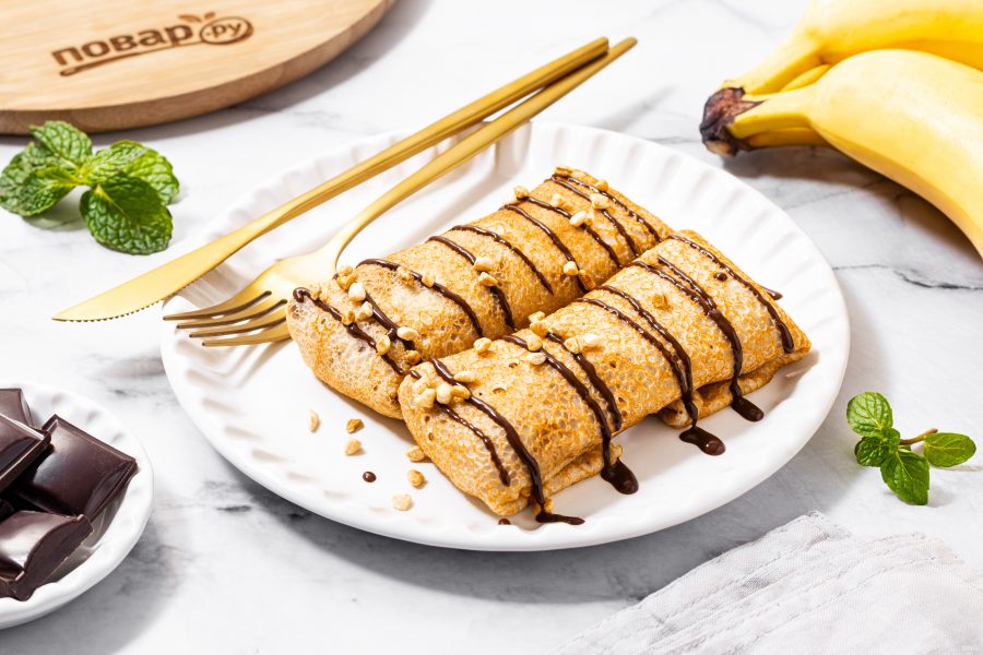 Выложите блины в тарелку для подачи, полейте шоколадным соусом. Сверху можно посыпать орешками или добавить воздушную кукурузу. Блины с шоколадом и бананом готовы, приятного вам аппетита!